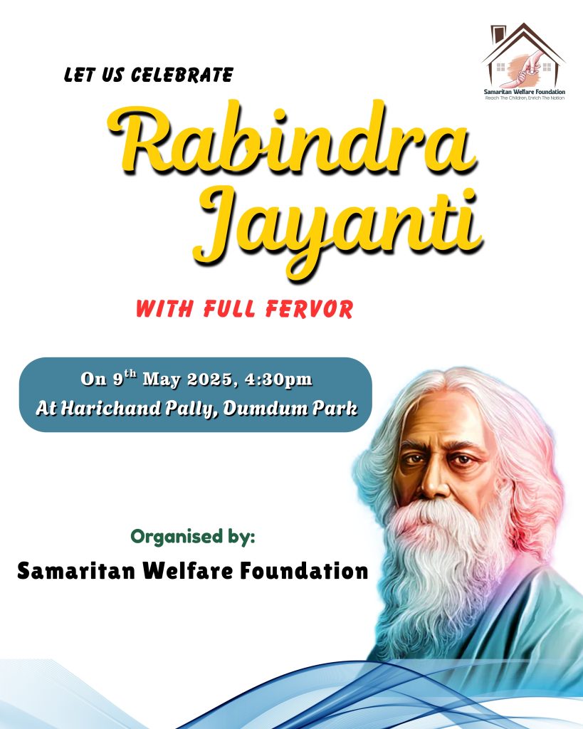 On 9th May, 2025 in Harichand Pally, Samaritan Welfare Foundation will give the tribute to mark the birth anniversary of the great Bengali poet, scholar, novelist, playwright, humanist, philosopher, and Nobel laureate—Kobiguru Rabindranath Tagore for his immense contributions to art, literature, and education. We encourage everyone to attend and participate in this inspiring event!